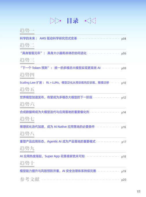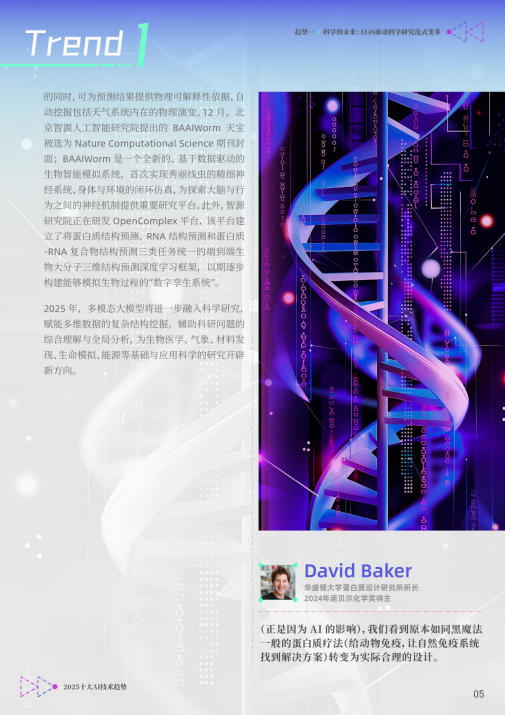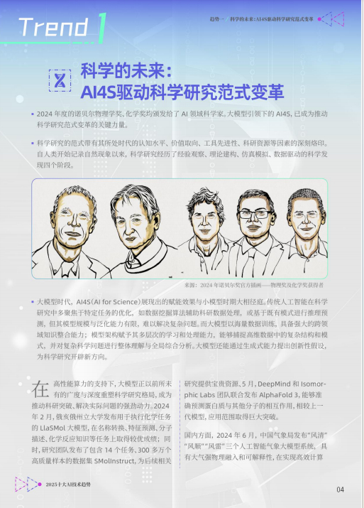 趋势一:科学的未来: Al4S驱动科学研究范式变革AI4S 驱动科学研究进入新阶段,大模型凭借强大的跨领域知识整合与创新假设能力,重塑科研格局。如 2024 年俄亥俄州立大学、DeepMind 等发布的相关模型在化学、蛋白质研究领域取得突破,国内也有气象、生物智能模拟等方面的成果。2025 年,多模态大模型将进一步助力科学研究。