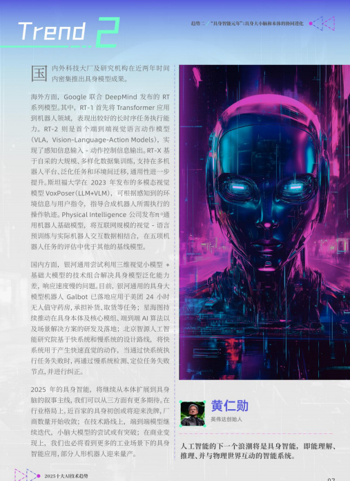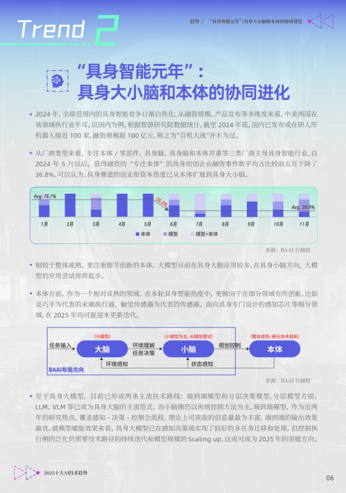 趋势二:“具身智能元年”:具身大小脑和本体的协同进化2024 年具身智能竞争激烈,中美领先。行业格局、技术路线和商业变现方面在 2025 年都将有新变化,如厂商或迎来洗牌,端到端模型持续迭代,工业场景应用增加等。国内外厂商和机构推出多种具身模型成果,推动技术发展。