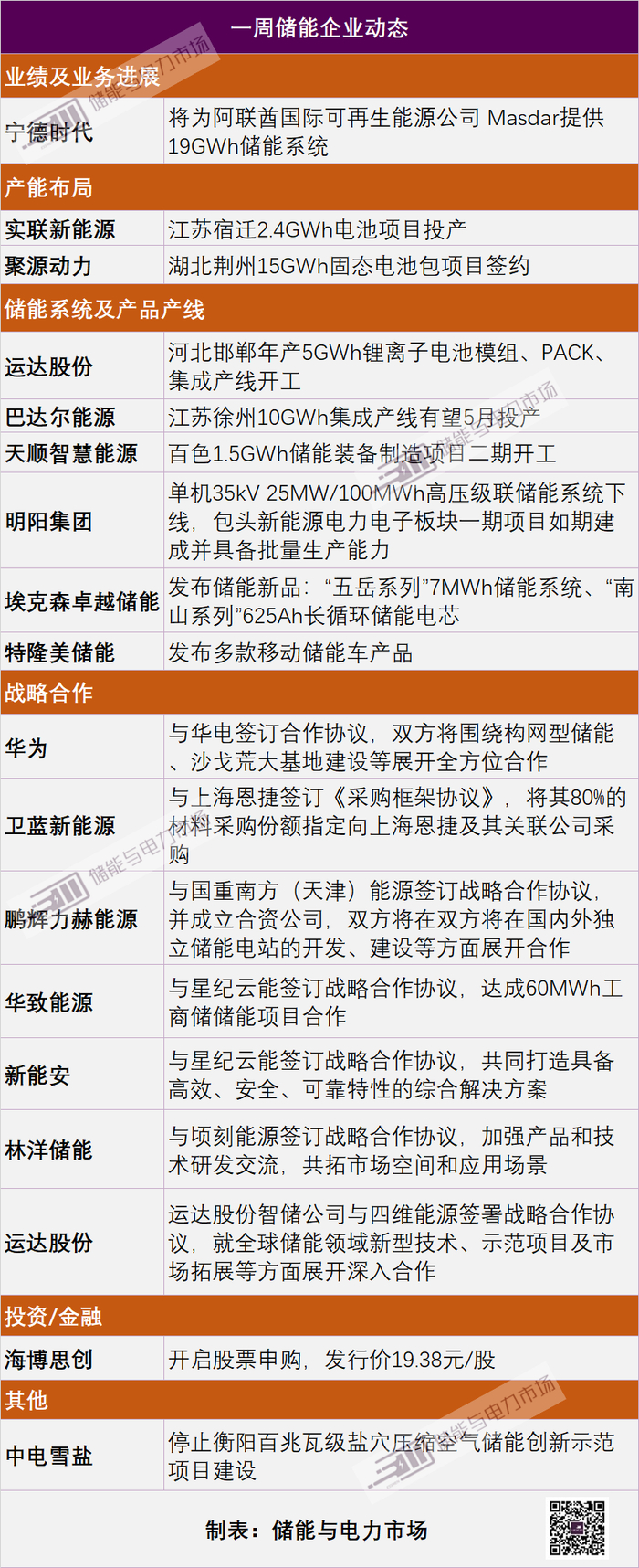 一周储能企业:海博思创/宁德时代/运达股份/华为/特隆美/鹏辉力赫/新能安/华致能源/林洋储能等