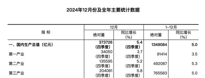 国家统计局公布,2024年国内生产总值(GDP)约为1349084亿元,同比增长5.0%。分产业来看,第一产业增长3.5%,第二产业增长5.3%,第三产业增长5.0%。分季度看,一季度同比增长5.3%,二季度4.7%,三季度4.6%,四季度5.4%。全年整体表现略高于部分经济学家的预期,但也有机构指出,名义GDP的增速仅有4.2%,这说明通货紧缩或价格下降在一定程度上抑制了企业利润增长。