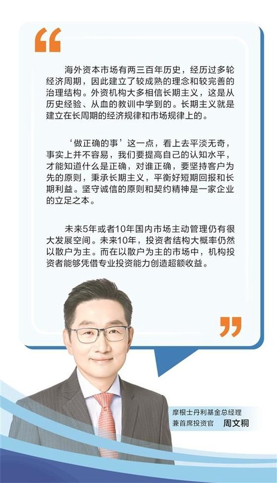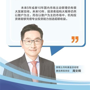 周文秱:未来5年或者10年国内市场主动管理仍有很大发展空间。未来10年,投资者结构大概率仍然以散户为主。而在以散户为主的市场中,机构投资者能够凭借专业投资能力创造超额收益。