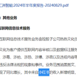 而汇洲智能所经营的业务与小红书能产生直接的经济收益。根据2024年汇洲智能半年报信息显示,汇洲智能子公司热热文化是一家为客户提供互联网内容审核以及数据标注服务的企业,2024上半年内容审核业务实现了同比增长,其中来自小红书的收入新增明显,另外还新开拓了得物、拼多多等平台的安全审核、生态审核、商品审核等类型。