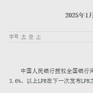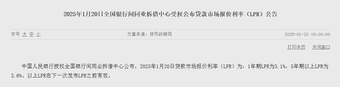 中国人民银行授权全国银行间同业拆借中心公布,2025年1月20日贷款市场报价利率(LPR)为:1年期LPR为3.1%,5年期以上LPR为3.6%。以上LPR在下一次发布LPR之前有效。