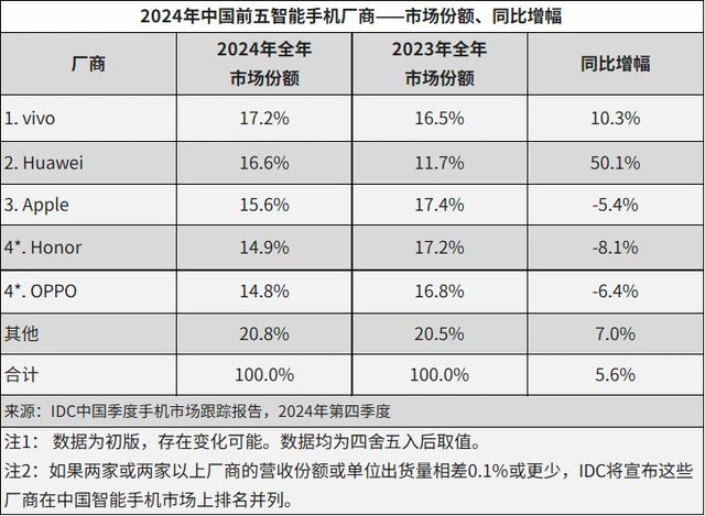 具体来看,2024年全年中国前五大智能手机厂商分别是,vivo、华为、苹果、荣耀和OPPO。单季度来看,最新的2024年第四季度,中国前五大智能手机厂商分别是,苹果、vivo、华为、小米和荣耀。