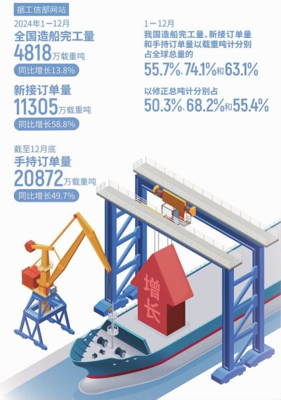 工业和信息化部2024年10月发布的数据显示,2024年1—9月,我国造船在完工量、新接订单量、手持订单量等三大指标上同比增长18.2%、51.9%、44.3%,分别占全球总量的55.1%、74.7%和61.4%,以绝对优势领先排在第二名的韩国。