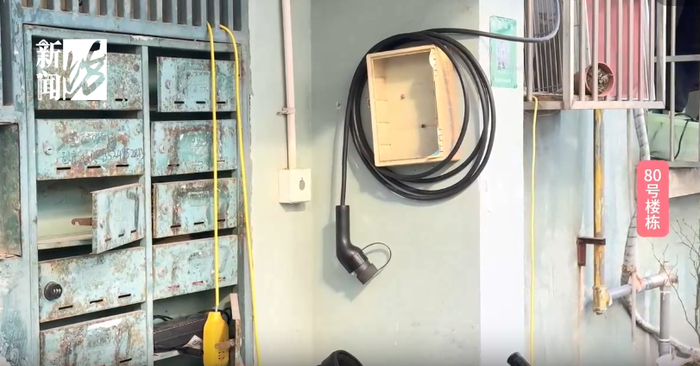 采访当天记者在富友嘉园小区二期进行了走访调查,发现该小区里10个单元门栋中,有9个门栋都存在高空飞线的情况,其中不仅有电动自行车飞线充电,还有三轮电瓶车、甚至新能源汽车。