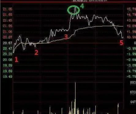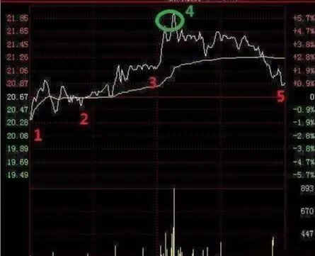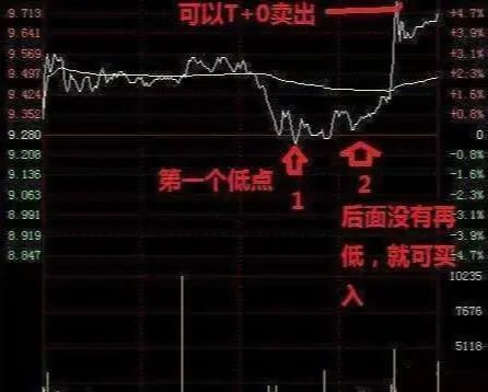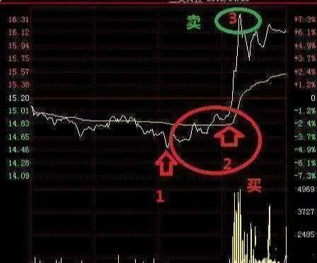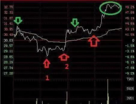 如下图,开盘后在低位震荡,但低点在一路抬高,那么在接近翻红的时候,买点2可以买入股票,后面如直线拉升的话,只要2-3个点以上,就要择机卖出了。假如买点2错过了机会,不要追,等直线拉升6个点左右,不能再往上冲的话,考虑把手中股票卖掉一点,等它下跌调整时再买进。
