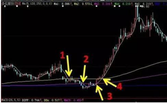 是指在三线开花的初始点,120日均线与250日均线是处于极度接近的平行状态,此时20日均线从下向上穿越这两条均线的技术走势,形成均线的金叉穿越。
