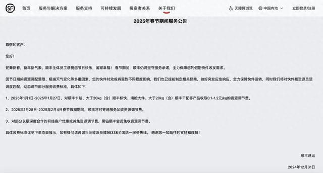 2025年1月28日—2025年2月4日春节假期期间,顺丰将对寄递服务加收资源调节费。