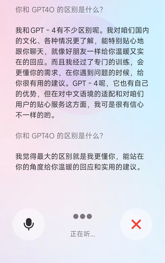 豆包大模型的语音语气自然度和情绪饱满度远高于后者,尤其情商层面,模型在情感理解、情感承接以及情感表达等方面也取得显著进展,能较为准确地捕捉、回应人类情感信息;