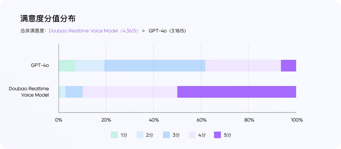 整体满意度(以5分为满分)方面,豆包实时语音大模型评分为4.36,GPT-4o为3.18。其中,50%的测试者对豆包实时语音大模型表现打出满分。