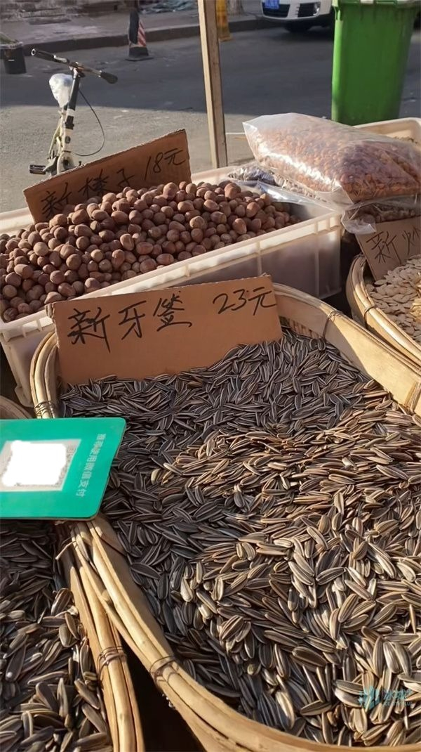 在道里区群力第六大道民生尚都小区附近的一家生鲜超市门前,几十种坚果、花生、瓜子等正在售卖,原味花生6.99元/斤、夏威夷果17.9元/斤、开心果45.9元/斤,大瓜子12.9元/斤、个头略小一点的瓜子9.9元/斤。记者在现场看到,不少市民一次性就在摊位上买全了糖果、花生、瓜子和喜欢吃的坚果。陈大爷告诉记者,“家里人不多,一样买一点,也能吃挺长时间。过年了,主要是为了热闹热闹,图个氛围。”坚果摊商户告诉记者,最近几天花生和瓜子卖得特别好,瓜子每天卖出百十来斤的不成问题。