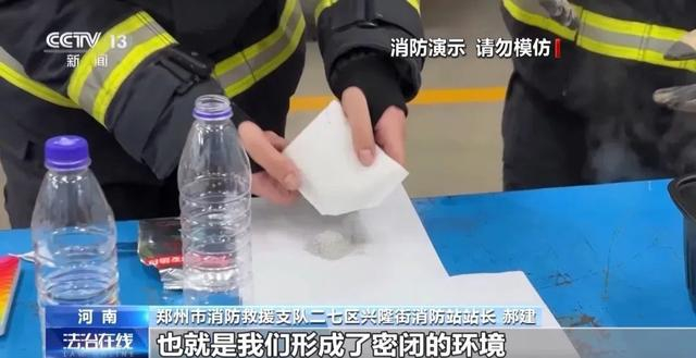 消防员以自热食品为例,进行了演示。在试验前,消防员准备好一袋自热包,一个空塑料瓶和一瓶矿泉水。
