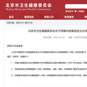 1月16日,北京市卫健委官网发布批复,同意抖音集团在朝阳区中关村朝阳园北区医疗服务地块(2905-0006地块)建设北京爱瑞医院(待定)。另据北京爱瑞医院(待定)公示变更登记注册公示信息,该医院为三级综合中外合资合作营利性医院,床位800张。