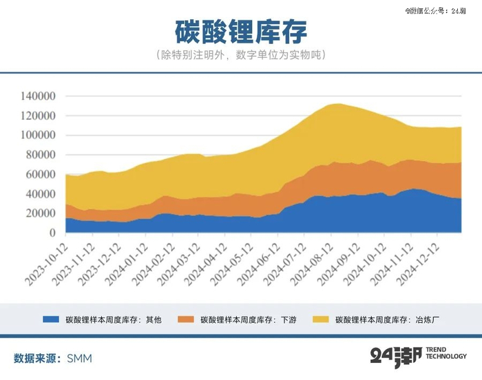 碳酸锂库存累积是行业库存的重要指标,24年以来碳酸锂库存不断累积,在市场对未来供给宽松及锂价下跌预期较为确定的背景下,库存重心大幅上移,前三季度持续处于累库阶段,进入24年四季度有所去库,但仍处于往年同期高位,库存压力仍然较重。