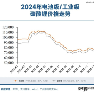 特别是在市场对供给过剩预期确定性较高的背景下,24年年内虽有数次因供给端扰动引发的短期反弹,但始终未能改变整体空头趋势。盘面表现不断探底,10月期价跌破(2023年)前低至6.97万元/吨后逐渐企稳并有所回升。截至2024年12月31日,碳酸锂主力合约收于7.33万元/吨,较年初下跌32%。全年锂价整体仍处于熊市周期。