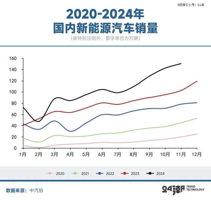 此外,由于地缘政治和贸易保护等原因,我国新能源汽车出口受限现象较为严重,据 “崔东树” 统计显示,2024年1-11月国内新能源汽车出口186万辆,同比增长13%,而去年同期增速为87%。其中11月新能源汽车出口量14万台,同比下降14%,环比上月下降32%。