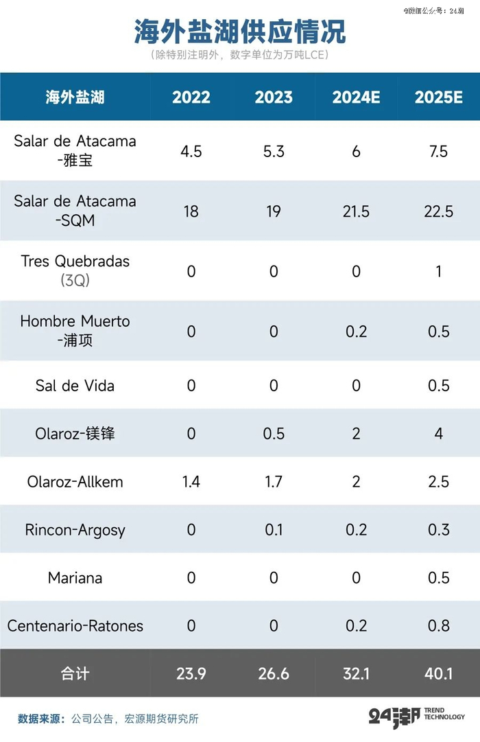 海外方面,南美目前对碳酸锂产量贡献*的仍是ALB和SQM在智利的Atacama盐湖项目,明年由于不少项目逐渐爬坡以及释放产能,整体盐湖产量将进一步快速释放。今年一季度SQM已经完成了Atacama项目1万吨扩建工程,产能持续提升;ALB-Atacama近两年扩产4万吨,2025年预计将继续爬坡。尽管紫金旗下3Q项目进展不及预期,目前或延期至2025年中投产,但POSCO的Sal de Oro已于10月顺利投产,Centenario也于12月正式投产。此外Olaroz、Hombre Muerto等项目的爬坡也会进一步增加25年产能的释放。根据宏源期货的数据,2025年以南美盐湖为主的海外盐湖供应将达到40万吨(折LCE),同比增长约25%。