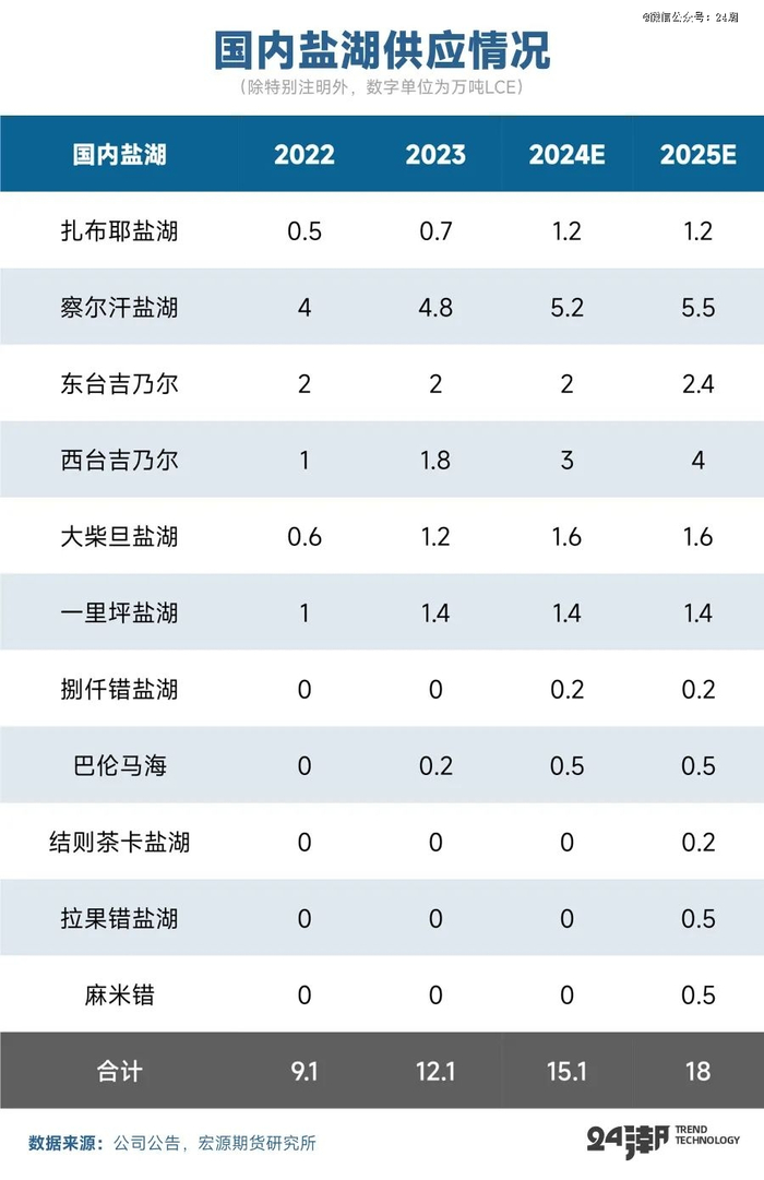 中国盐湖方面,察尔汗盐湖、东台吉乃尔和西台吉乃尔贡献了较大的产量。其中,察尔汗盐湖作为中国*的盐湖之一,2024年计划新建的4万吨碳酸锂项目正在推进,25年产量仍将进一步释放;中信国安西台盐湖项目以及西部矿业东台吉乃尔项目在25年产能进一步扩张,加上个别项目有开始运行的希望,25年合计将贡献18万吨 LCE,同比增长19%。
