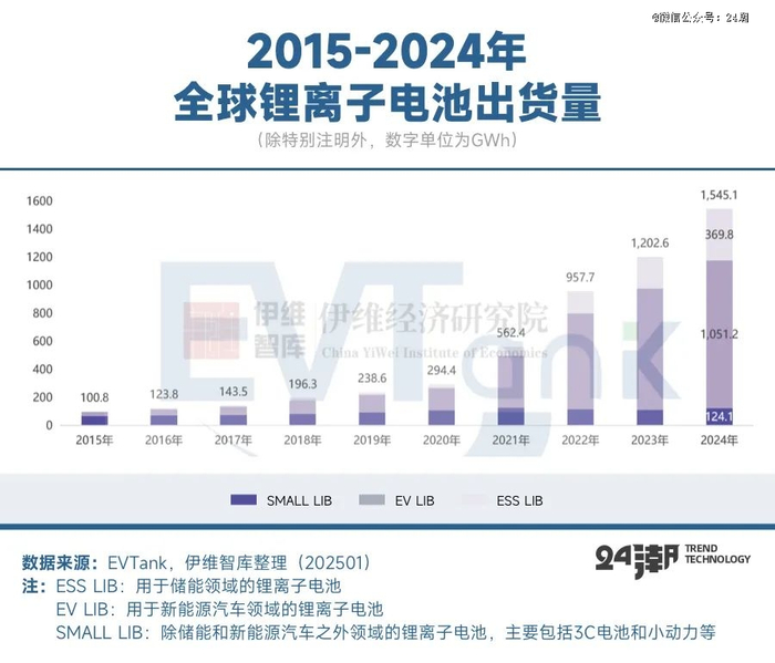 据研究机构EVTank联合伊维经济研究院共同发布的《中国锂离子电池行业发展白皮书(2025年)》显示,2024年全球锂离子电池总体出货量1545.1GWh,同比增长28.5%。从出货结构来看,全球汽车动力电池(EV LIB)出货量为1051.2GWh,同比增长21.5%;储能领域,全球储能电池(ESS LIB)出货量369.8GWh,同比增长64.9%,主要是由于2024年中国新能源强配政策、央国企强化布局及储能成本不断下探,带动ESS保持超高速增长;美国配储刚性需求叠加ITC补贴的效果明显,此外新兴市场多点爆发,2024下半年英国、沙特、澳大利亚等签订多个GWh订单,带动24年储能电池增速可观。