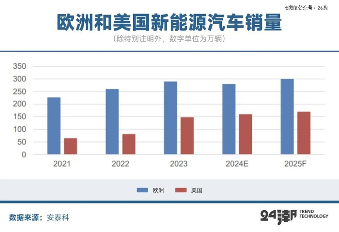 展望2025年,美国方面,市场对于特朗普新任政府带来的压力表达了相当程度的担忧。24年美国新能源汽车占全球总市场的9%。随着特朗普政府的上台,其主张削减对电动汽车的支持,保护传统燃油汽车行业,计划取消拜登政府时期的电动汽车税收抵免政策并终止对电动汽车和充电基础设施的建设支持,叠加其宣称将对中国进口的商品加征10%的关税,若特朗普政府上台后落实以上政策,或将对其国内及全球新能源汽车产业的发展速度造成一定阻碍。此外,欧盟对我国企业掀起的反补贴调查亦将对我国新能源汽车出口带来一定挑战。由于产业成熟度以及政策扶持力度的差异,预计未来全球新能源汽车销量的主要增长动能仍来自中国。但需留意国内以旧换新政策的持续、欧美能源转型节奏将影响2025年需求的延续性。
