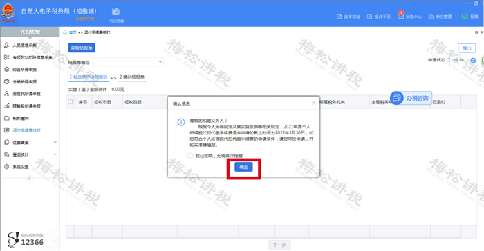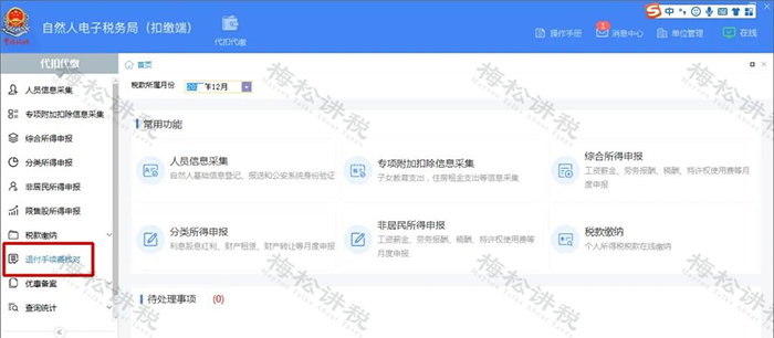 第二步:登录扣缴端后,在“代扣代缴”界面,点击左侧菜单“退付手续费核对”。