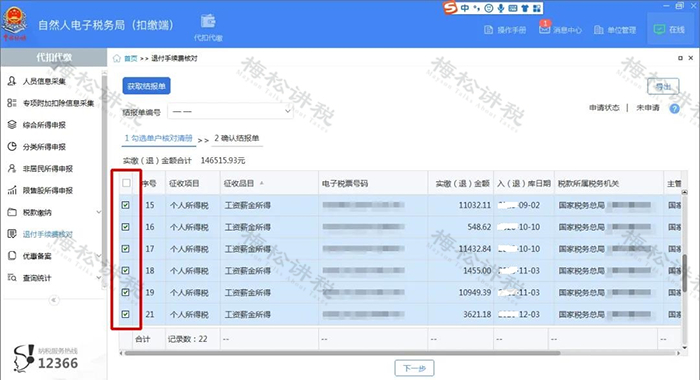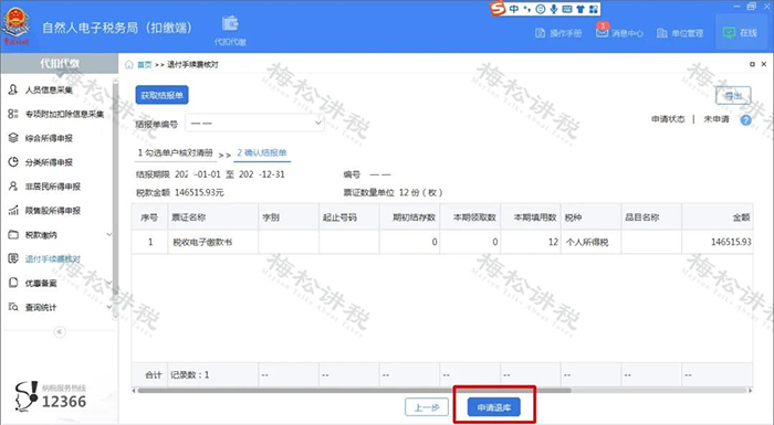 第三步:点击【获取结报单】按钮获取“结报单”和“单户核对清册”,分别查看核对上一年度本单位个人所得税扣缴汇总与明细申报记录,确认实缴(退)金额及入(退)库时间是否正确。