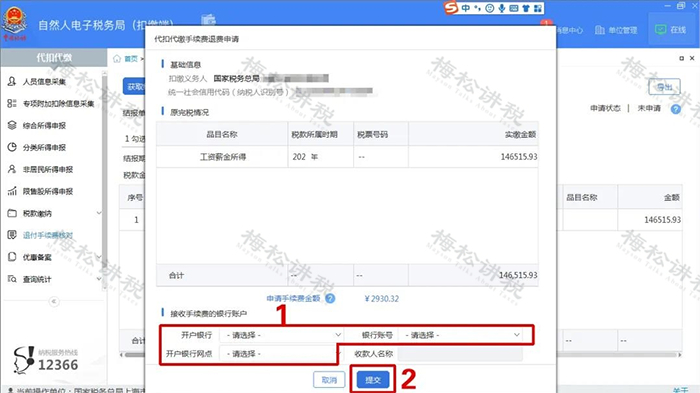 第五步:在【代扣代缴手续费退费申请】中依次选择“开户银行”“银行账号”【提交】。