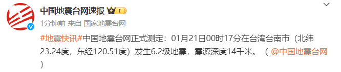中国地震台网正式测定:01月21日00时17分在台湾台南市(北纬23.24度,东经120.51度)发生6.2级地震,震源深度14千米。