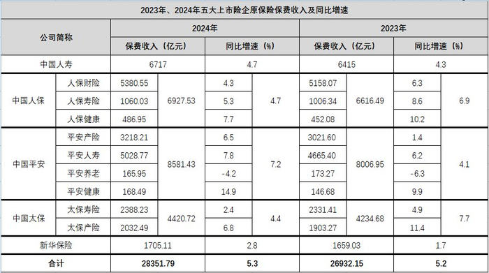 2024年,中国人寿、中国人保、中国平安、中国太保和新华保险分别实现保费收入6717亿元、6927.53亿元、8581.43亿元、4420.72亿元和1705.11亿元。