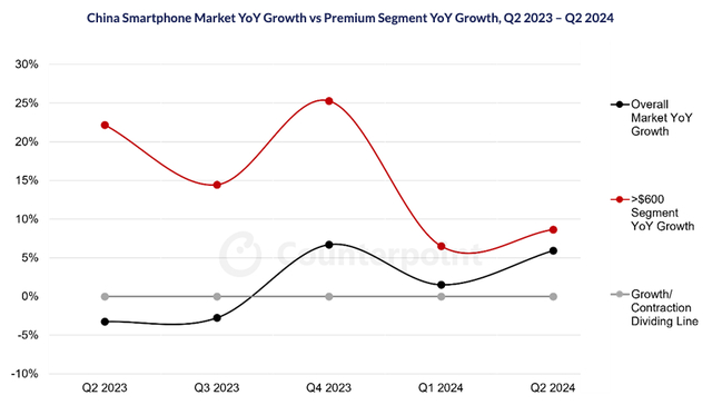 首先,我们来看看高端。虽然2024年是智能手机市场回暖的一年,但这场回暖却显得有些冷热不均。根据CounterpointResearch数据,2024年上半年中国手机市场加速推进高端化进程,超过600美元(约合人民币4345元)的细分市场销售量同比增长了8%,而整体市场同比增长仅为4%。高端产品的热销也将推动手机价格水涨船高,预计全球智能手机平均售价将在2023年至2028年期间以3%的复合年增长率增长。