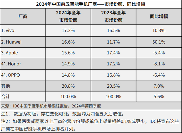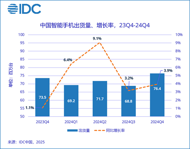而在国内市场方面,根据IDC发布的数据,2024年全年中国智能手机市场出货量约2.86亿台,同比增长5.6%,时隔两年触底反弹。