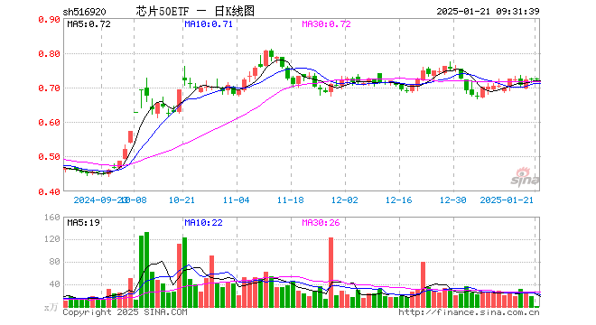 1月21日,芯片50ETF(516920)开盘涨0.28%,报0.724元。芯片50ETF(516920)重仓股方面,中芯国际开盘涨0.45%,北方华创涨0.63%,海光信息涨0.52%,韦尔股份涨0.30%,中微公司涨0.60%,澜起科技涨1.10%,兆易创新涨0.77%,寒武纪涨0.00%,长电科技涨0.19%,三安光电涨0.34%。