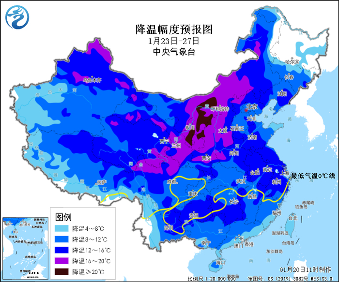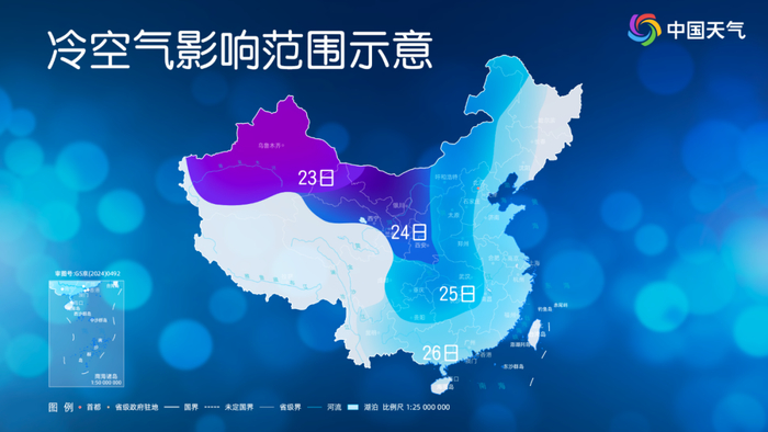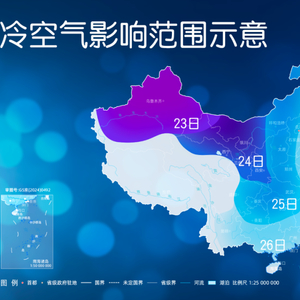 预计23日至27日,受寒潮影响,我国大部地区气温普遍下降8~12℃,其中西北地区东部、华北中西部、黄淮西部及新疆中北部、内蒙古中东部等地降温幅度可达14℃以上,上述地区并伴有4~6级偏北风,阵风7~9级;27日至28日,我国东部海域有7~9级大风,渤海、黄海风力达10~11级。其中,寒潮23日影响新疆,24日影响西北地区,25日至26日影响中东部大部,27日继续影响东北地区、江淮东部、江南、华南等地。过程结束后,28日早晨最低气温0℃线将南压至贵州到江南中北部一线。
