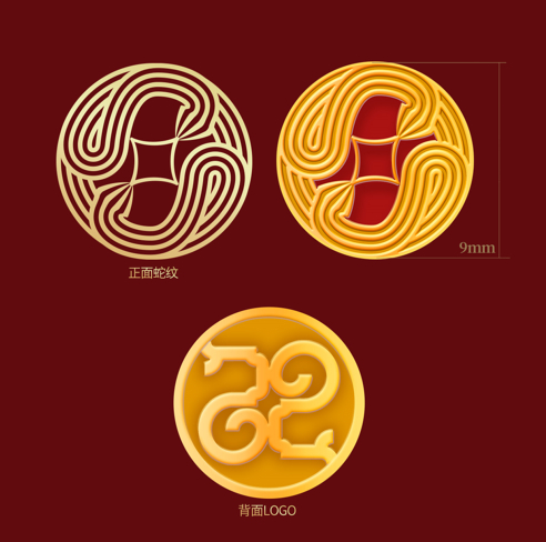 《春晚生肖手串》上的金饰一面以双蛇吐信巧妙构成古钱币图案,一面为蛇年logo,寓意新的一年平安和谐,吉祥富足。