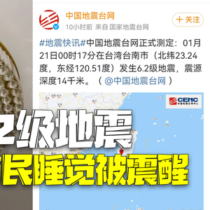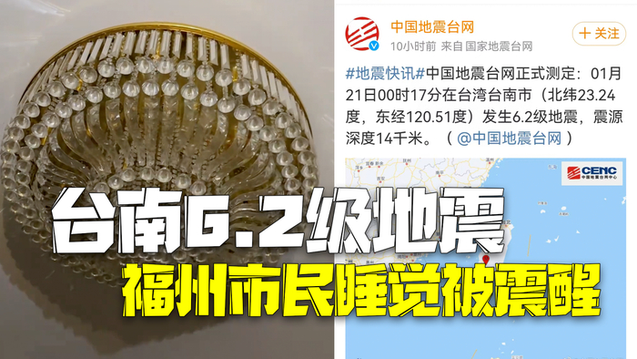 中国地震台网正式测定,1月21日0时17分,台湾台南市发生6.地震造成台湾全岛震感强烈,泉州、厦门、福州、莆田等地震感明显,宁波、上海、杭州等地亦有震感反馈。福州市民周先生称,睡觉时感觉床在晃,发现客厅水晶灯也在响,震感挺明显的!