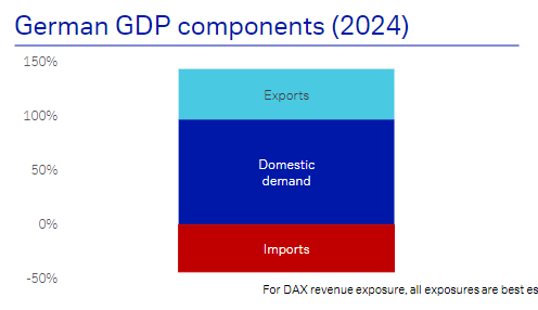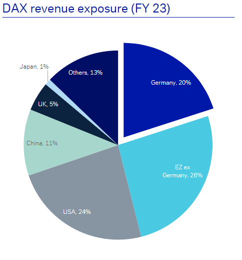 报告表示,DAX成分股公司80%的收入来自德国以外地区,其中美国市场占24%,而德国本土公司只占到20%。相比之下,德国GDP主要依赖国内需求。
