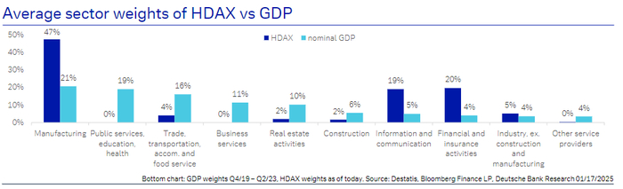 在近日发布的研报中,德银分析认为,双方之所以存在差异的主要原因在于,DAX指数企业多为出口导向,本土需求贡献不大,并且DAX指数和GDP的行业构成差异比较大,前者的涨幅主要是由龙头股“七巨头”推动的。