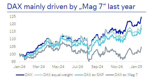 报告数据显示,2024年内DAX涨幅的98%来自“七巨头”,其中光是SAP一家就贡献了7.8%的涨幅——若剔除这7只股票,2024年DAX指数自2023年底以来仅上涨5%。