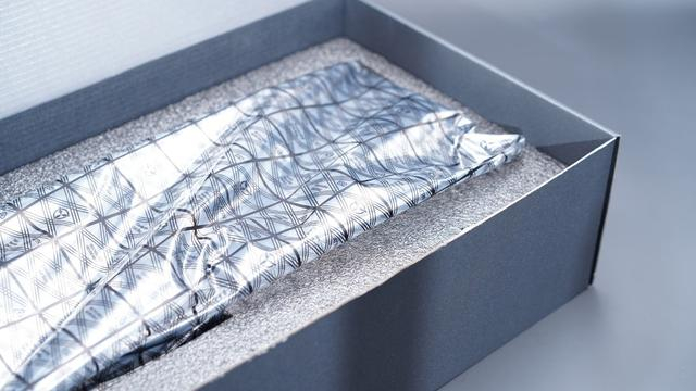 打开外包装后,内部的包装也十分精致。显卡被一层带有独特几何图案的银色防静电袋包裹着,这种设计不仅能够有效防止静电对显卡造成损害。盒内四周填充着柔软的灰色泡沫材料,为显卡提供了全方位的缓冲保护,确保在运输过程中显卡不会受到磕碰和挤压。