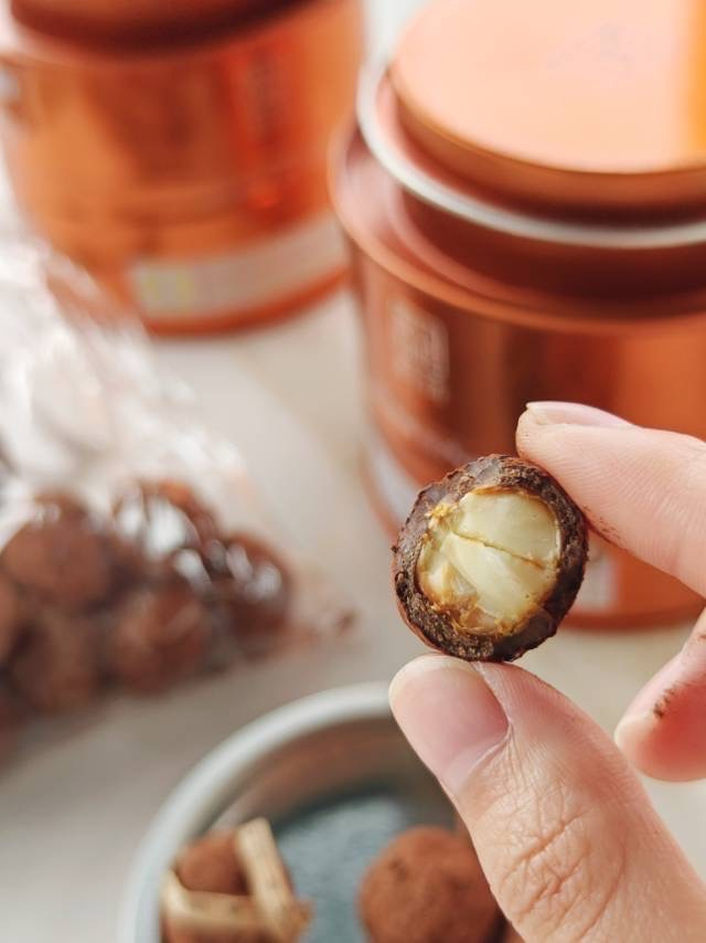 粒粒饱满的坚果均匀的黑巧克力包裹着,一口下去坚果香瞬间在你的舌尖爆发。