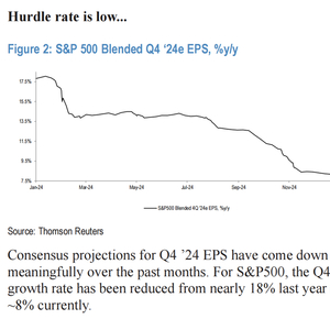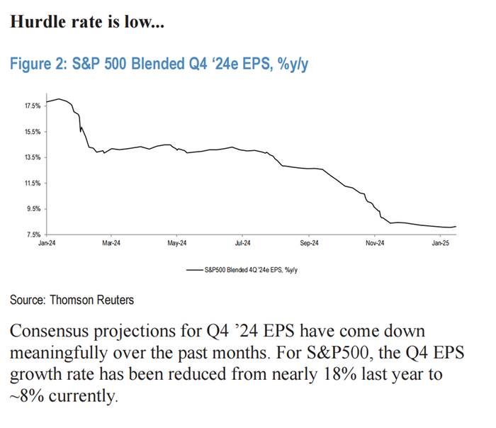 根据摩根大通的分析,S&P 500指数的Q4盈利预期在过去几个月中大幅下调,目前同比增长率仅为8%,远低于去年初预测的18%。
