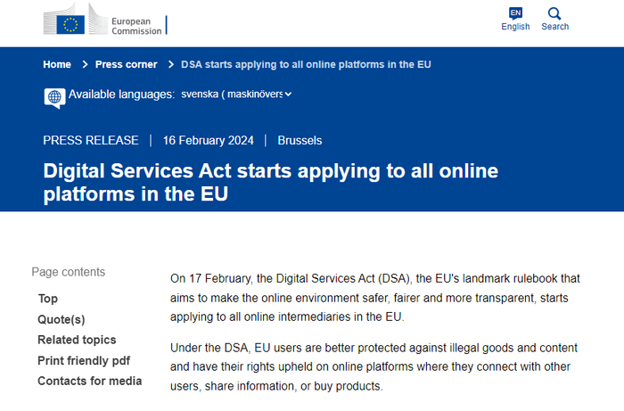 欧盟委员会在2024年2月16日发表公告宣布,欧盟《数字服务法》(Digital Services Act,DSA)将于17日正式在所有网络平台生效。该法案涵盖社交媒体审核、电商广告推送以及打击假冒商品等多个方面,旨在确保用户在使用过程中的安全。
