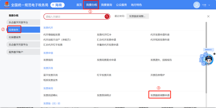或者在全国统一规范电子税务局(新电子税局)首页热门服务,点击【发票业务】—【发票额度调整申请】,进入功能页面。