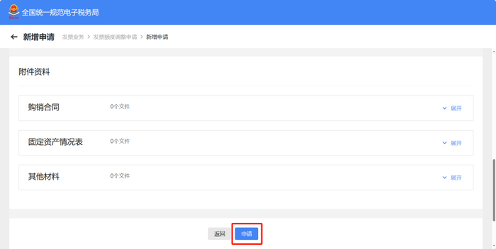 下拉至附件资料模块,上传相关资料后,点击【申请】。提交申请后,会跳出提交成功提示,点击【确定】,等待人工审核。