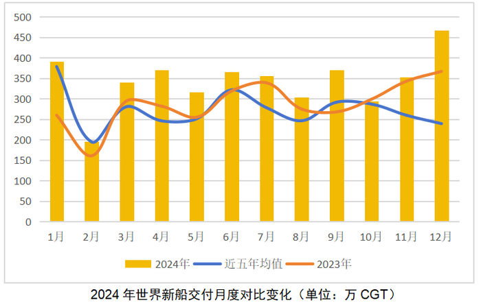 造船完工量和手持订单量实现近两成增长。2024年,世界新造船交付4124万CGT,同比增加19.1%,较近5年均值高出25.9%;12月,完工船舶467万CGT,同比增长27.2%,创年度新高。当前数据反映出造船业的完工速度持续加快,供给端的能力稳步增长。截至12月底,世界手持订单1.5亿CGT,同比增长22.9%。