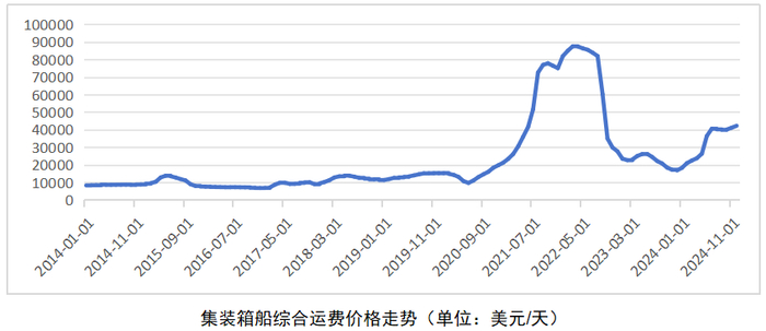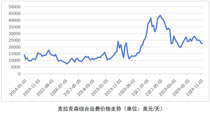 航运业近年来受突发事件的影响最为明显,运费市场也在大起大落中寻找供需两端最合适的位置。从2024年的走势来看,市场整体呈现波动下滑的态势,年初年末的综合运费价格跌幅达到18%。特别是进入后半年,液货运输(含原油、成品油、LNG、LPG)、干散货以及汽车运输等主要货运船型出现明显回调,有些船型的运费已经回归历史常态。仅有集运市场继续受红海危机、自然灾害等突发因素保持了可观的增长。如果下游航运收益出现大幅波动,可能会影响船东的现金流水平,对部分船东持续执行新造船或更新船队的计划产生影响,将不利于新造船市场。