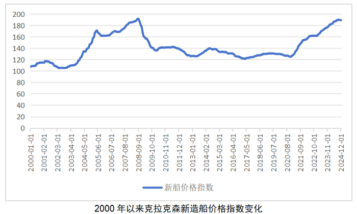新造船价格保持在历史高位。以克拉克森船价指数为例,2024年12月,新造船价格指数收报189.16点,同比增长6.5%,保持2008年10月以来的新高。如果换个视角,以指数的年度均值来看,2024年新造船价格指数已经小幅超过2008年,创下历史新高。另外,部分新船型已经是历史新高。近年来,占市场份额较高的超大型集装箱船、17.4万方LNG运输船、9万方VLGC、9000车及以上PCTC等船型的船价均是历史新高。价格是市场走势的重要信号,我们要看2024年四季度以来造船价格指数明显进入平台期,预示当前市场供需两端出现了一些变化。