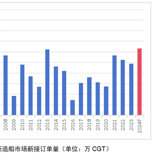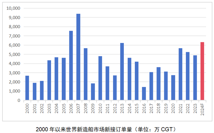 市场新接订单创年度新高。2024年,世界新造船市场新接船舶订单6307万CGT,同比增长46.6%,比近五年同期成交均值(2019-2023)高出67%。2024年新接订单量创17年以来新高,仅次于上一轮造船超级周期的2006年和2007年,位列历史上的第三高。以载重吨(DWT)计,1-12月世界成交新船15247万DWT,同比增长42.6%,也位列历史前五。