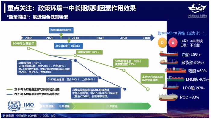 2025年,全球海事界关注的国际海事组织(IMO)重量级会议即将举行,将迎来一个涉及航运业重大利益的关键决策。2025年4月,IMO成员国将在国际海事环境保护委员会(MEPC)第83次会议上共同决定航运业如何成功实现2050年碳中和,并阶段性实现具有雄心的中期目标。预计备受瞩目的经济措施将会被讨论,进一步完善,并在10月召开的下一届会议上批准通过。一个与航运业利益“直接”挂钩的经济与技术规则体系将基本形成,将从规则方面继续进一步强化全球船队的绿色转型,并支撑造船业持续的技术创新与市场稳定。